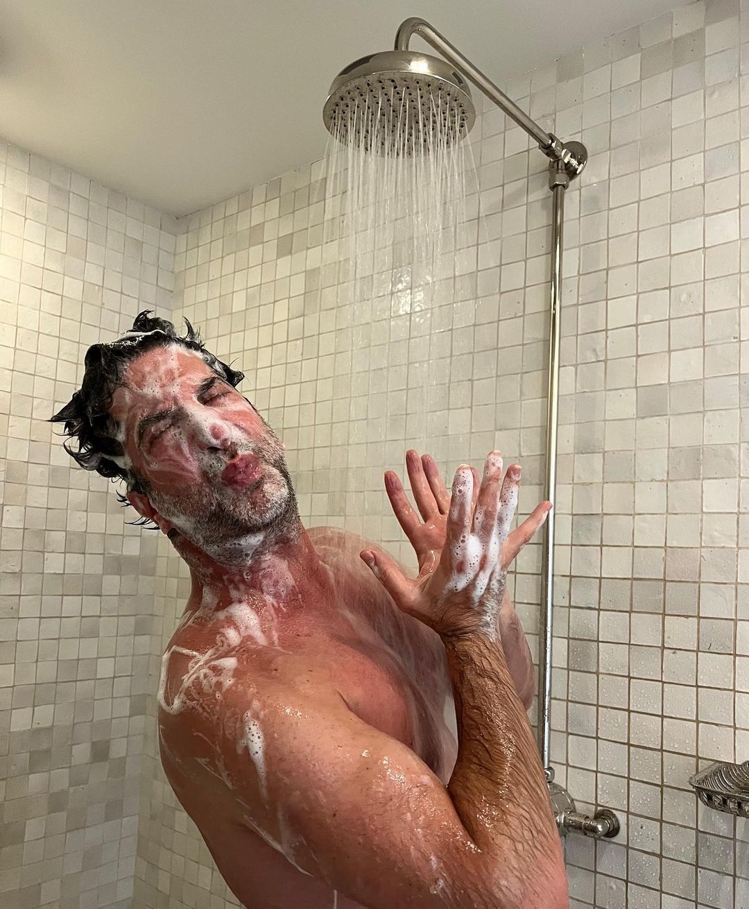 El actor publicó una foto duchándose, pero con la cara cubierta de jabón y una expresión de asco mientras le pedía a Aniston que le pase una toalla en los comentarios de la foto.