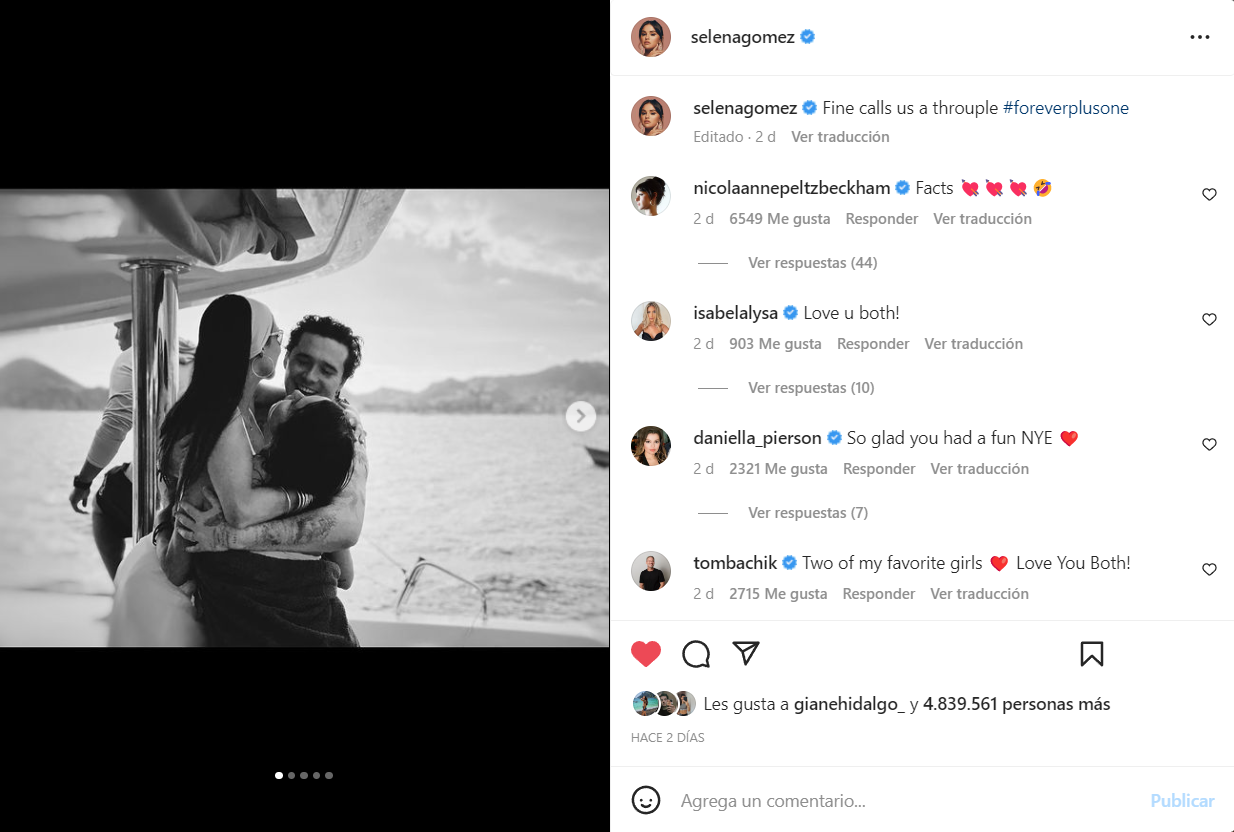 Luego, durante las celebraciones de Año Nuevo, Selena Gomez volvió a avivar los comentarios luego de una serie de publicaciones y fotografías donde se la ve pasando tiempo con Nicola y Brooklyn. Los tres se encontraban de viaje junto a otro grupo de amigos, y entre las fotografías se podía ver a los tres demasiado juntos y pegados. Fue ahí cuando comenzaron a surgir los rumores de que la artista se encontraba en una relación de a tres con la pareja.