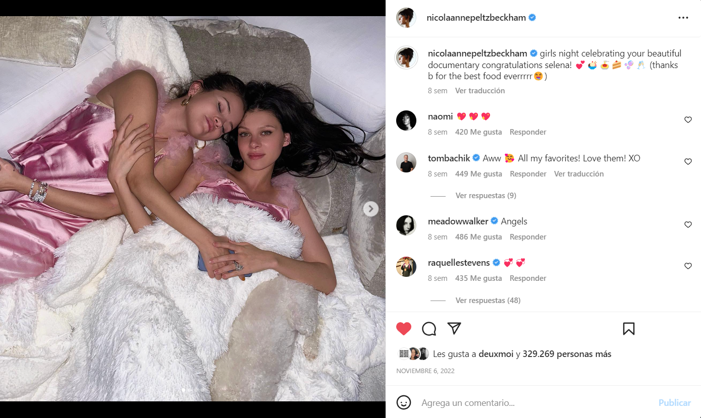 Pero eso parece no importarle a Selena, quien desde noviembre se ha mostrado muy cercana a la pareja. Una de las primeras publicaciones surgió durante el estreno del nuevo documental de la cantante, Selena Gomez: My Mind & Me. En aquel entonces, Nicola publicó una serie de fotografías donde se la puede ver con un grupo de amigas, donde se encontraba Selena, y donde todas utilizaban pijamas idénticos, indicando además que su esposo había estado presente para prepararles tragos.