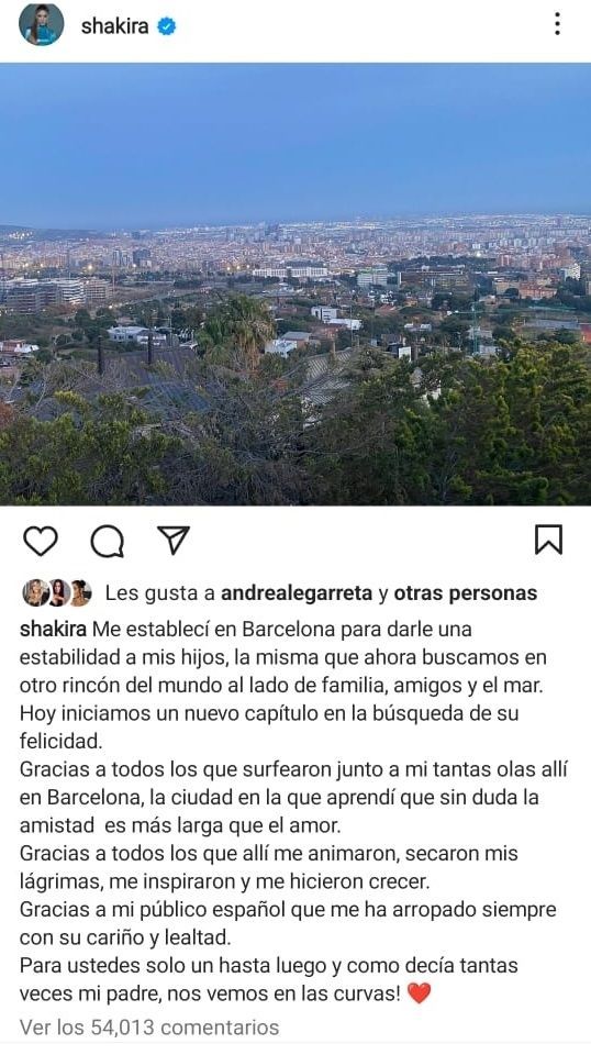 Gracias a mi público español que me ha arropado siempre con su cariño y lealtad. Para ustedes solo un hasta luego y como decía tantas veces mi padre, nos vemos en las curvas!", finalizó Shakira en su publicación de Instagram, la que acompañó con una imagen panorámica de Barcelona.