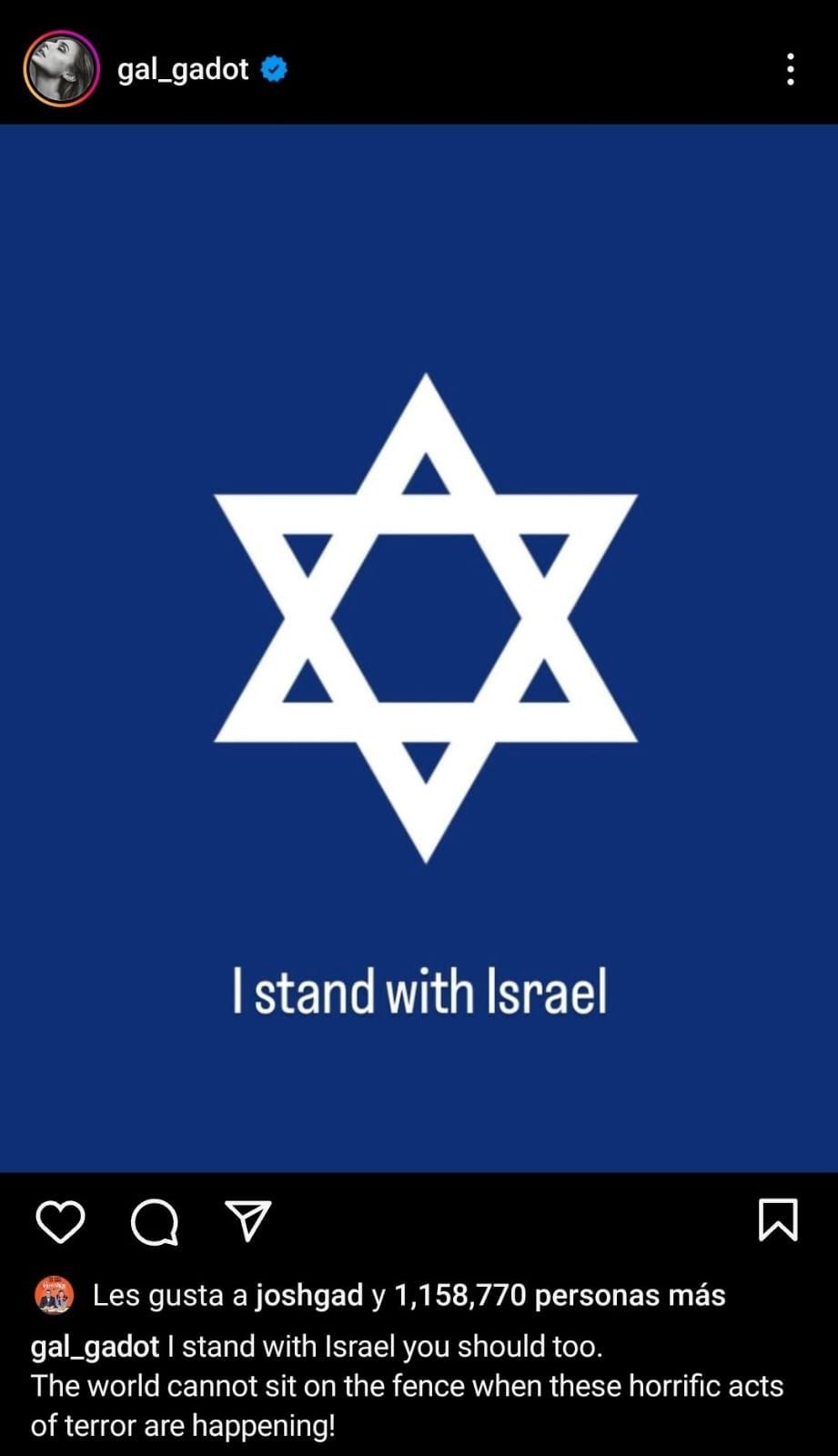 "En este momento hay cientos de israelíes inocentes desaparecidos, sus familias rotas y rogando por cualquier información, cualquier pista que los ayude a traerlos a casa", escribió la actriz en una de sus publicaciones vía Instagram. "Yo apoyo a Israel y tu deberías también. ¡El mundo no puede sentarse en la valla cuando estos horribles actos de terror están ocurriendo!", compartió Gadot con sus más de 109 millones de seguidores en la red social.
