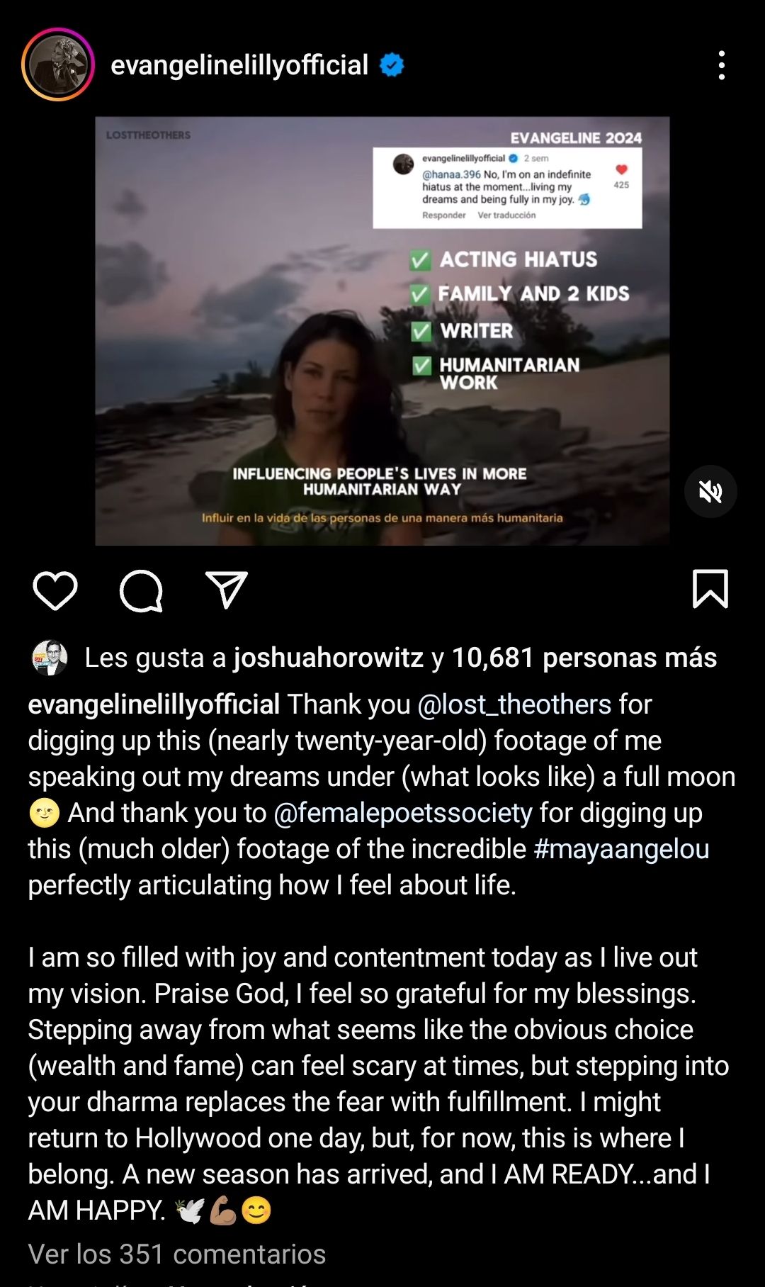 A través de una publicación en su cuenta de Instagram, Lilly expresó que se “alejará” del cine estadounidense en el futuro. Un emotivo post que incluye un video de si misma en su momento de mayor auge, 2006, donde una Evangeline del pasado compartía sus sueños para el futuro entre lo que se encontraba convertirse en una “actriz jubilada”, formar una familia y centrarse en el trabajo humanitario.