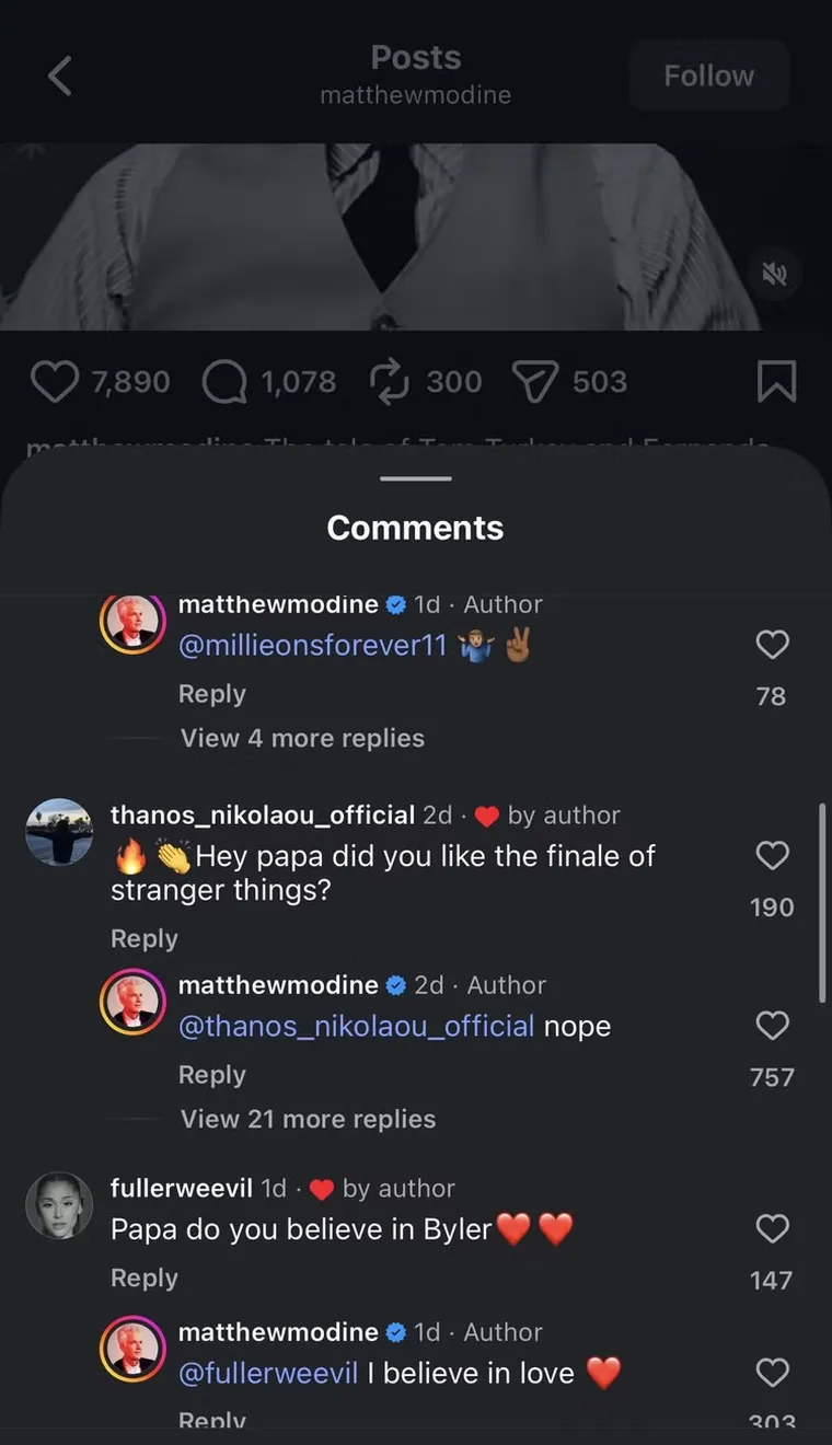 La historia, sin embargo, no quedó ahí. En otro comentario dentro del mismo posteo, Modine respondió a una pregunta más irónica que directa: “¿Papa cree en Stranger Things episodio 9?”. A lo que respondió: "Eso espero, por los fans". El supuesto episodio 9 de la temporada final hace referencia a la teoría del "Conformity Gate" a través de la cual, muchos fanáticos comenzaron a especular con la existencia de un capítulo adicional no anunciado de forma oficial.