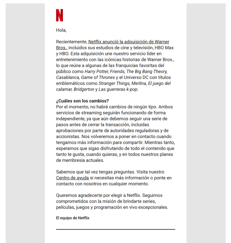 En el mensaje, Netflix describe la operación "une su servicio de entretenimiento con las icónicas historias de Warner Bros.", y hace mención de algunas franquicias favoritas como Harry Potter, Game of Thrones y el Universo DC Comics, por mencionar algunos. Sin embargo, la compañía de la N roja aclara que, por el momento, no habrá cambios. Ambos servicios seguirán funcionando de forma independiente, al menos hasta tanto la compra se complete, algo que depende de aprobaciones regulatorias y del accionariado.