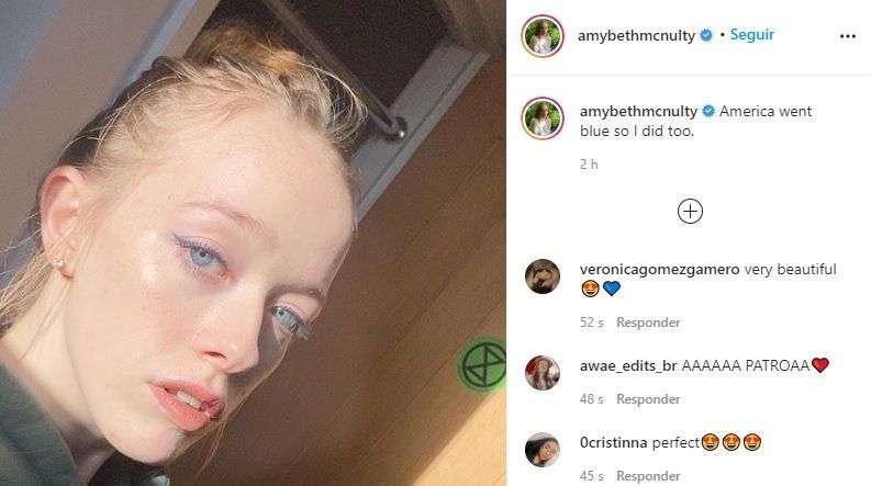 Nacida en Irlanda pero viviendo en Estados Unidos, AmyBeth McNulty posteó varias fotos donde mostró en primer plano sus espectaculares ojos azules pero con el detalle de tener las pestañas pintadas de azul, como celebración al triunfo de Joe Biden en las elecciones a presidente de EEUU.