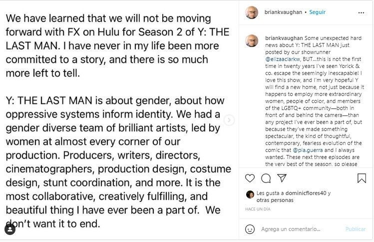 Para Clark el portazo de Star+ no significa el final de la historia ya que tanta ella como el equipo creativo están “comprometidos a encontrar un nuevo hogar para Y”.