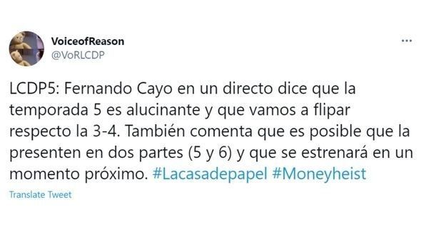 Además, Cayo anticipó que la quinta temporada podría dividirse en dos partes. No sería la primera vez que la serie española se divide en dos partes, ya que Netflix ya recurrió a esta modalidad en entregas anteriores de la ficción española. De hecho, la primera temporada de la serie se lanzó en dos partes en la plataforma de streaming.