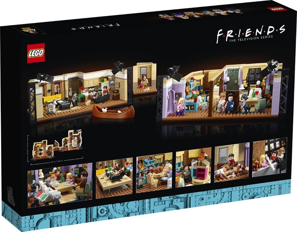 Este enorme set, está compuesto por 2.048 piezas. Al armarlo nos encontramos con el departamento de Rachel (Jennifer Aniston) y Monica (Courteney Cox), además del departamento de Joey (Matt LeBlanc) y Chandler (Matthew Perry). Pero eso no es todo, también incluye el pasillo que va entre los dos, así como luces fijas que le dan una sensación de estudio.