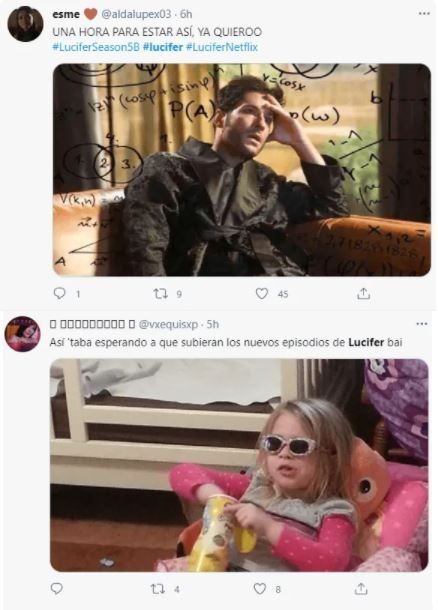 Tras un receso de 280 días que se vio atravesado por la pandemia del coronavirus, la temporada 5B de Lucifer ya está disponible en la pantalla de Netflix. Los ocho nuevos episodios de la serie protagonizada por Tom Ellis cambiaron la mañana de este viernes para los aficionados, que ya expresaron su felicidad en las redes sociales con muchas reacciones y los infaltables memes. En esta nota compartiremos los mejores y sin caer en spoilers.
