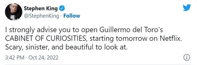 "Recomiendo encarecidamente abrir el GABINETE DE CURIOSIDADES de Guillermo del Toro, a partir de mañana en Netflix. Aterradora, siniestra y hermosa a la vista", escribió King en un tweet que ya cosecha más de 35 mil Me Gusta.