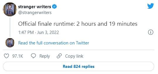 Sin embargo, para sorpresa de todos, los guionistas de Stranger Things confirmaron que el capítulo 9 no será tan largo como se anticipó. A través de la cuenta oficial de los escritores de la serie, se reveló que el mismo tendrá una duración de 2 horas y 19 minutos.