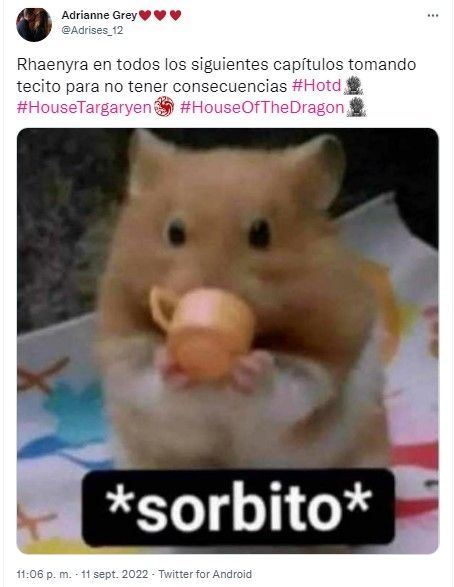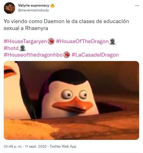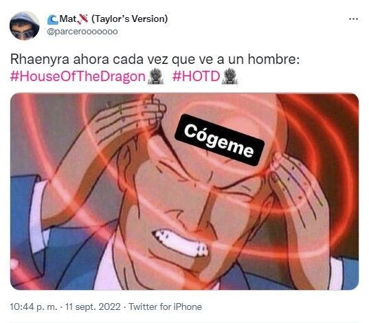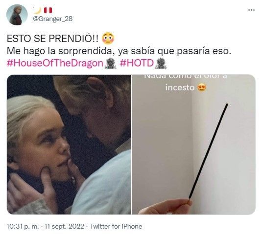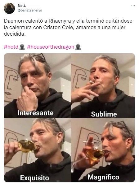 Desde luego que este fue un capítulo muy esperado por los fanáticos, y como suele ser habitual después de cada episodio, los memes no tardaron en llegar. Tras la emisión de la serie, las redes sociales se llenaron de comentarios en torno a la escena más osada de la serie, que involucra a Rhaenyra y Daemon.