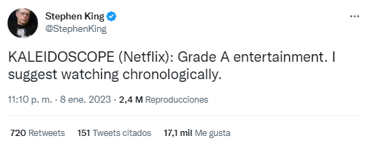 Además de haber conquistado a las audiencias del mundo entero, también conquistó a Stephen King. El reconocido maestro del terror se declaró fanático de la serie protagonizada por Esposito. Pero el autor de Carrie y El resplandor fue aún más lejos y aconsejó a los fanáticos cuál es el mejor orden para ver Caleidoscopio.