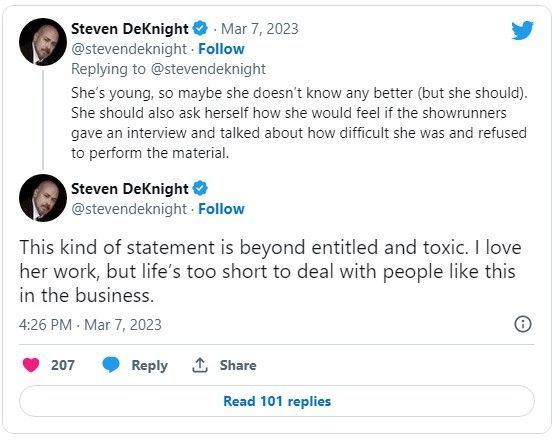 "Ella es joven, así que tal vez no sabe (pero debería)", escribió en un hilo de Twitter DeKnight. "También debería preguntarse cómo se sentiría si los showrunners dieran una entrevista y hablaran sobre lo difícil que fue y se negaron a interpretar el material", agregó.