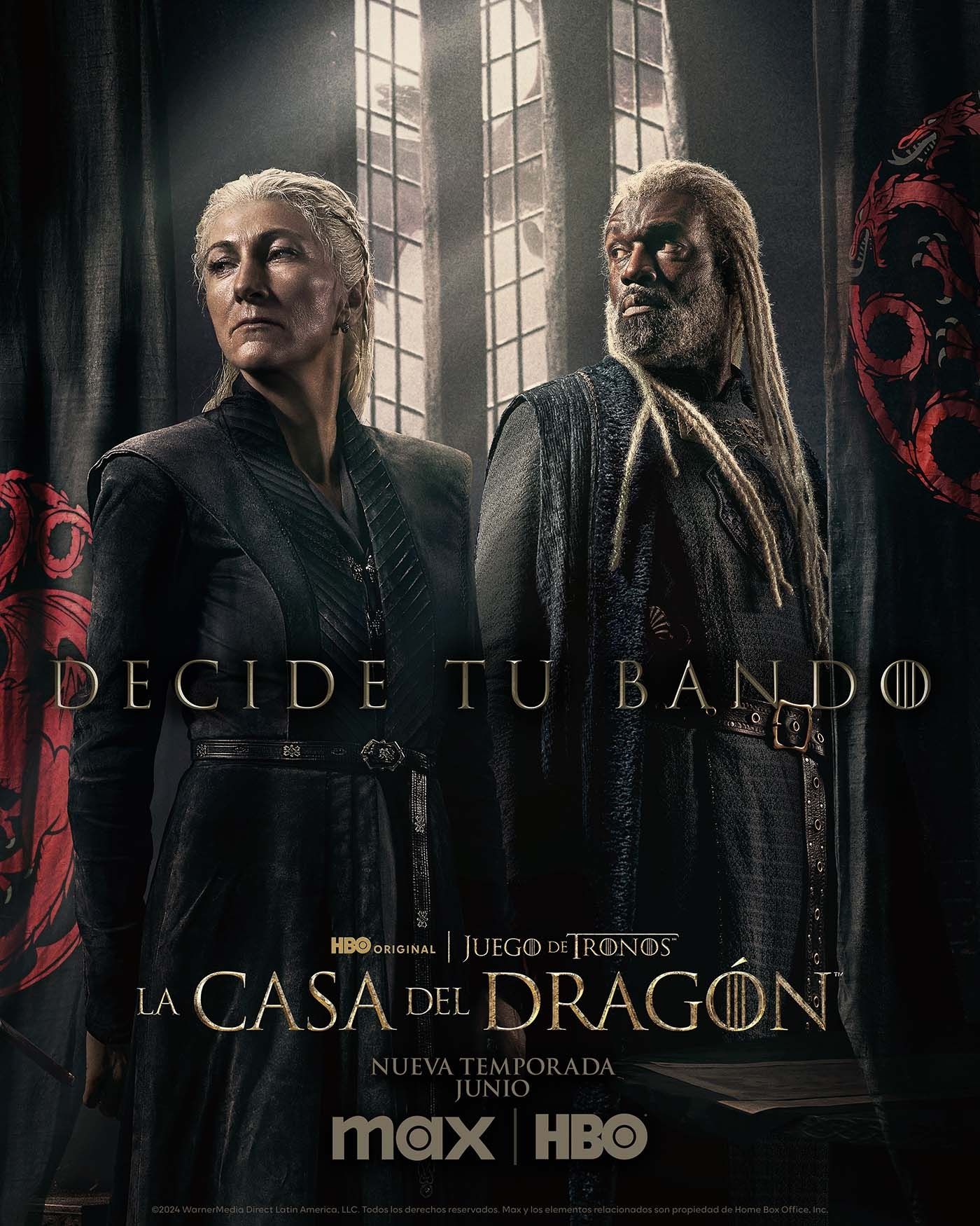 La guerra entre dragones se avecina y desde Max muestran a las dos partes y deberemos elegir a una de ellas. Por un lado tenemos al Conejo Negro, formado por la verdera heredera al trono, Rhaenyra Targaryen (Emma D’Arcy), acompañada de su esposo el príncipe Daemon Targaryen (Matt Smith). Ellos no estarán solos, ya que cuenta con el apoyo de La Serpiente de Mar, Corlys Velarion (Steve Toussaint) y su esposa, la aguerrida la princesa Rhaenys Targaryen (Eve Best)
