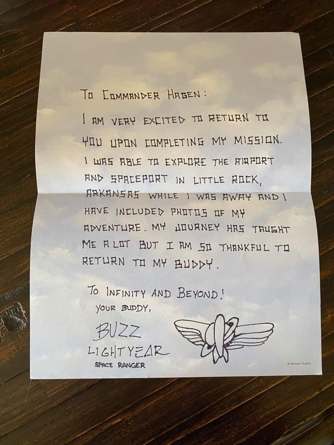 âEstoy muy emocionado de volver a ti luego de completar mi misión. Mientras estuve fuera, fui capaz de explorar el aeropuerto y el puerto espacial en Little Rock, Arkansas. Aquà tengo fotos de mi aventura. Mi viaje me enseñó demasiado y estoy muy agradecido de regresar con mi amigoâ dice una parte de la emotiva carta.