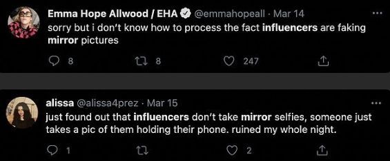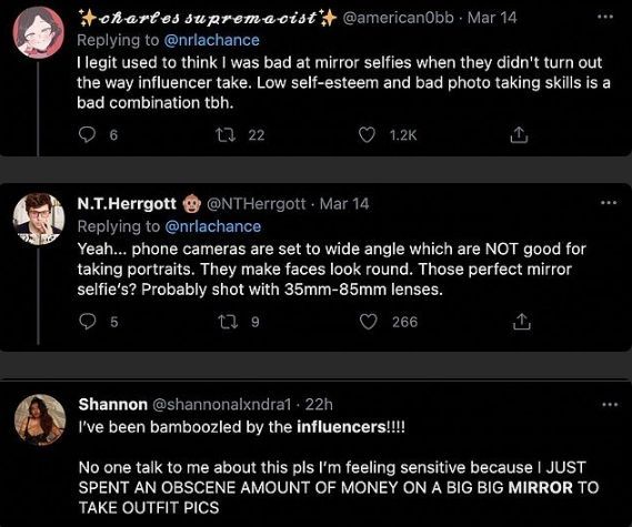 "¡Hemos sido engañados por los influencers! Gasté una enorme cantidad de dinero en un espejo gigante para poder tomarme buenas selfies", se quejó uno de los usuarios al descubrir la teorÃa.