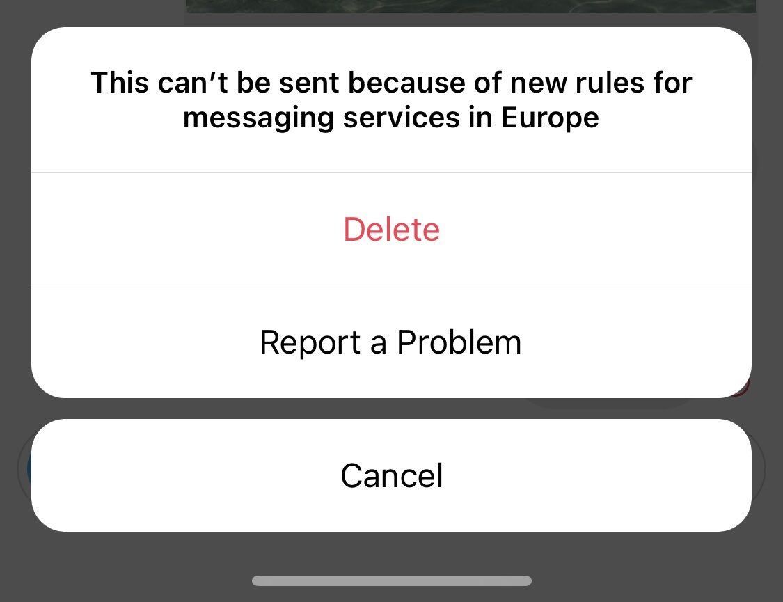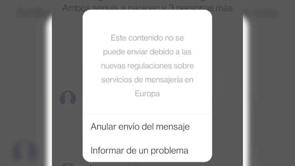 Muchos usuarios se sorprendieron este miércoles al intentar enviar un mensaje temporal en Instagram y recibir el mensaje "Este contenido no se puede enviar debido a las nuevas regulaciones de mensajerÃa en Europa". Las dos únicas opciones en ese caso son anular el envÃo del mensaje o informar de un problema si creemos que ha habido un error.
