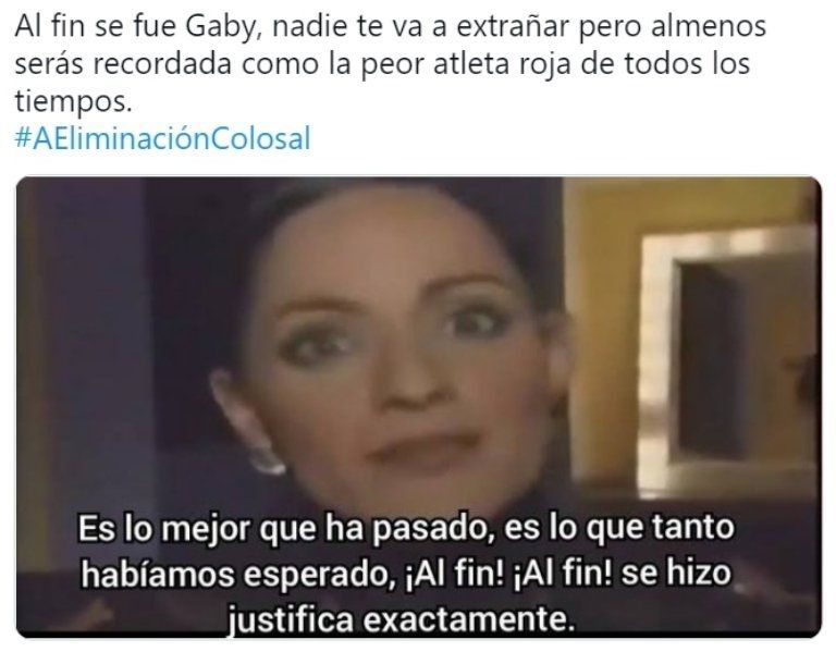 Los fanáticos del programa celebraron la eliminación de Gabriela a puro meme en redes sociales. La atleta no era muy querida porque no mostraba demasiada actitud cuando competía con su equipo, pero sí lo hacía en duelos individuales, eliminando a sus compañeras.