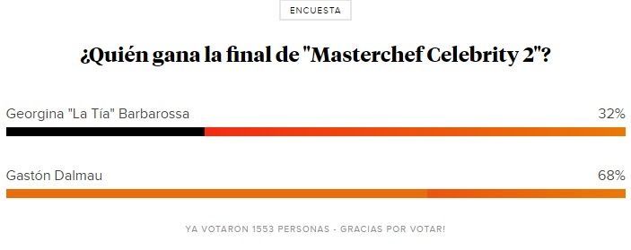 En Quever.news consultamos a nuestros lectores, quién ganará. La votación se inclinó (hasta este momento) con un 68% para Gastón Dalmau y un 32% para Georgina Barbarossa. ¿Será que Gastón gana? lo sabremos esta noche de jueves.
