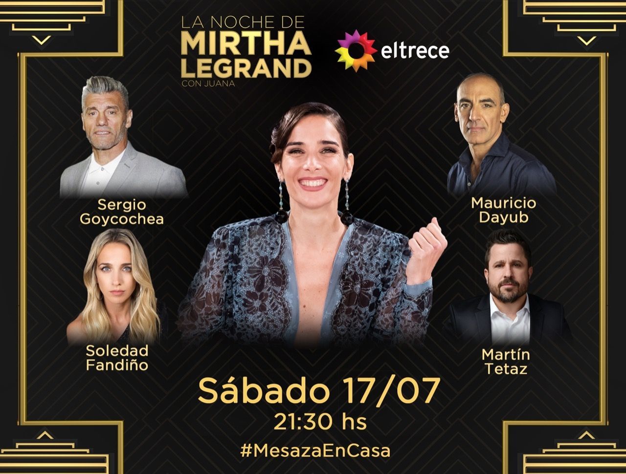 El día domingo desde las 13.30, Juana contará con otra mesa llena de comensales del mundo del espectáculo. Almorzando con Mirtha Legrand tendrá de invitados a la cantante Gladys la Bomba Tucumana; el director teatral Pepe Cibrián; el actor Agustín Rada Aristarán; y Diego Bustamante, emprendedor y referente de la Asociación Civil Pata Pila.