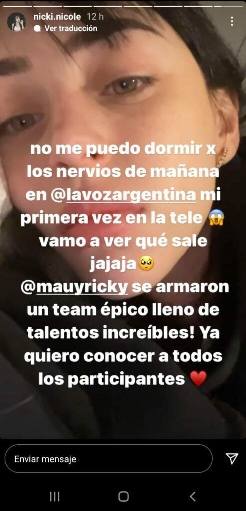 Justamente fue Nicki Nicole quien realizó una confesión de último momento a través de su cuenta de Instagram. La cantante de trap estará colaborando con el equipo de Mau y Ricky y en las primeras horas de este miércoles, día de su aparición en La Voz Argentina, expresó todo su nerviosismo por estar en el programa de Telefe. "No me puedo dormir por los nervios de mañana en La Voz Argentina. Mi primera vez en la tele, vamo' a ver que sale", comenzó escribiendo la cantante.