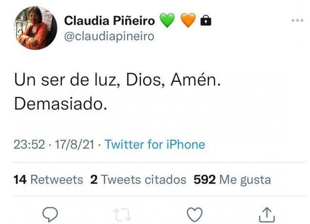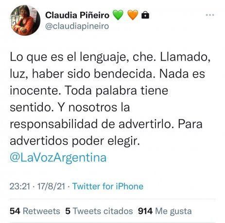 "Lo que es el lenguaje, che. 'Llamado', 'luz', 'haber sido bendecida'. Nada es inocente. Toda palabra tiene sentido. Y nosotros la responsabilidad de advertirlo. Para advertidos poder elegir", escribió Claudia Piñeiro en su cuenta de Twitter, que además aprovechó para mencionar la cuenta oficial de La Voz Argentina.