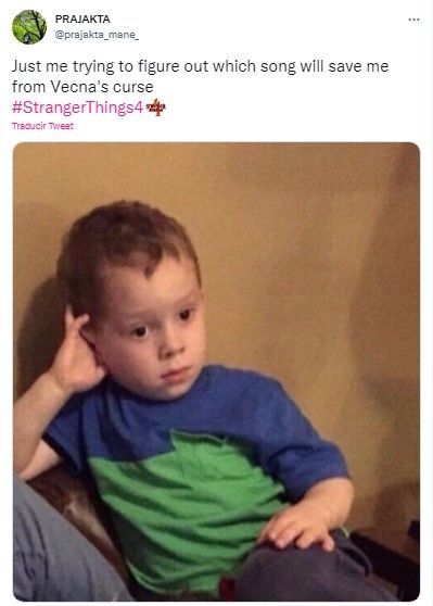 La épica escena protagonizada por Max, donde Vecna quiere acabar con ella, pero se salva gracias a su canción favorita, se convirtió en el meme favorito del público. “Tratando de averiguar qué canción me salvará de la maldición de Vecna“, dice uno de los memes que alcanzó más de 13 mil likes.